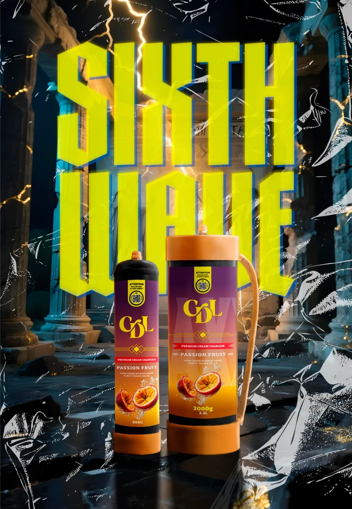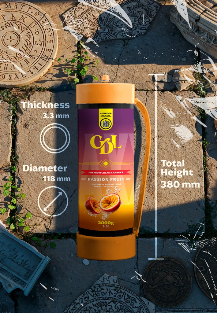 2000 grammes de N2O de qualité alimentaire d'une pureté testée de 99,9% enveloppés dans de l'acier de haute qualité. Cream Deluxe Sixth Wave Edition MAXXI est équipé d'une poignée en plastique pour être transporté en toute occasion.